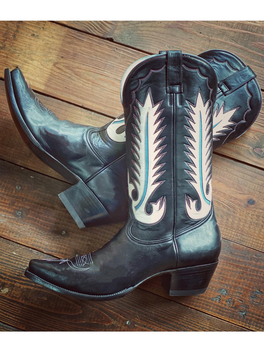 Black Snip-Toe White Feather Inlay Wide Mid Calf Tall Cowgirl Boots