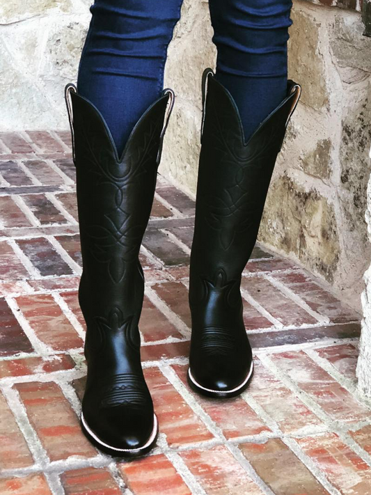 Black Vegan Leather Embroidery Almond-Toe Wide Knee High Tall Cowgirl Boots