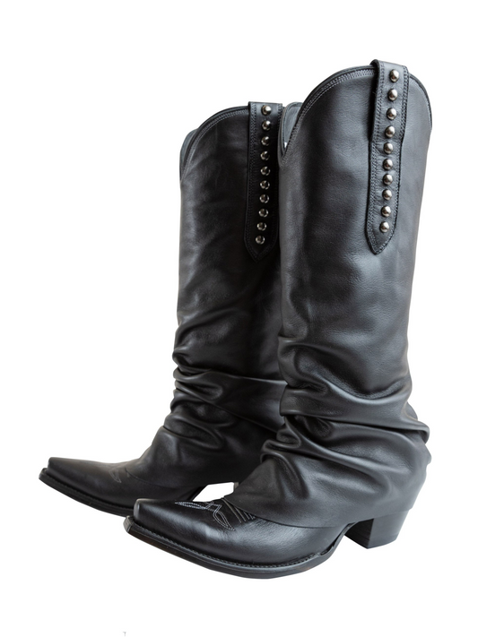 Black Snip-Toe Studded Tall Wide Mid Calf Fold-Over Slouch Cowgirl Boots