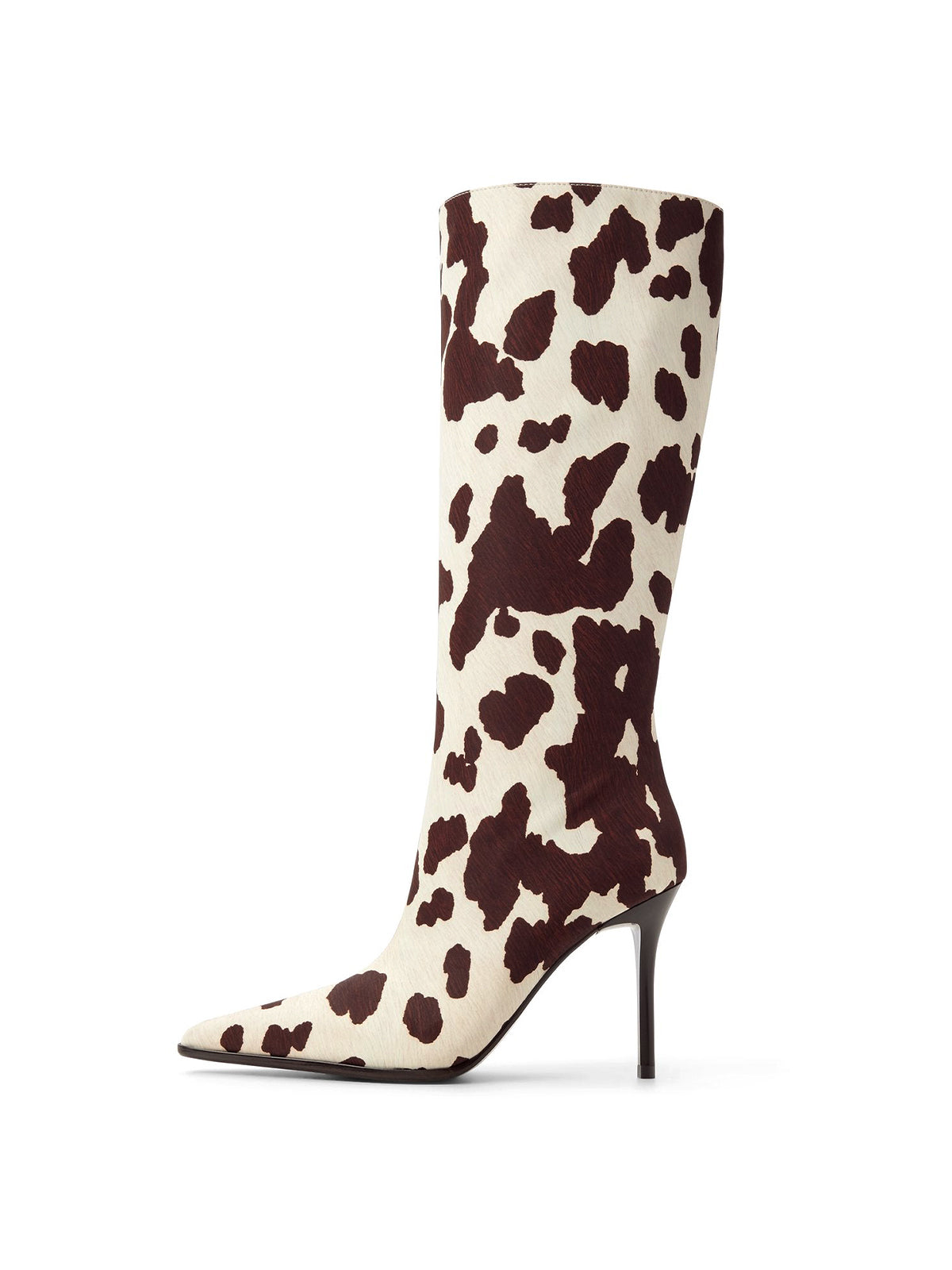 Cow Print Pointed-Toe Full-Zip Knee High Stiletto Boots