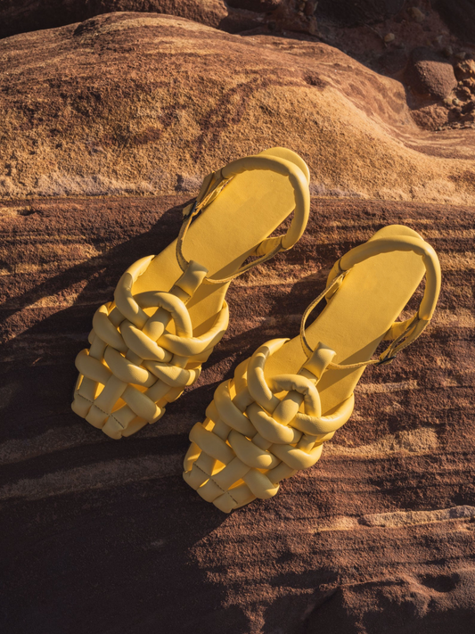 Yellow Padded Strap Interwined Square-Toe Flats Sandals With Ankle T-Strap
