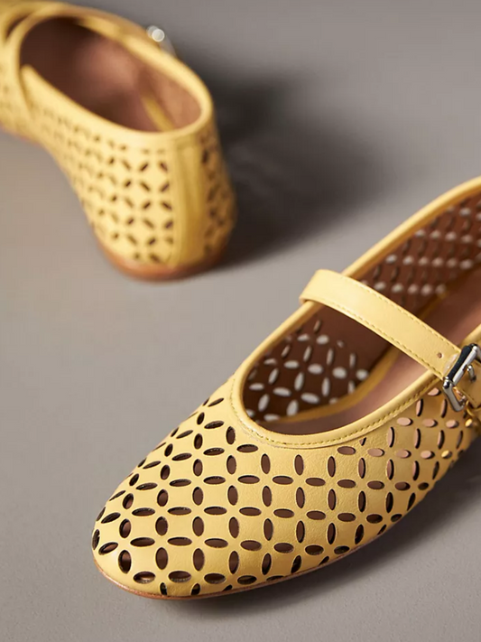 Yellow Flats Mary Janes With Floral Cutout And Buckled Strap