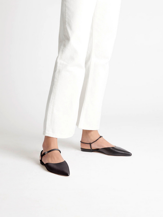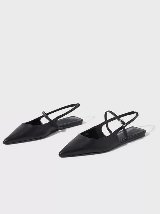 Black Pointed-Toe Slingback Ballerina Flats With Rhinestone Buckle