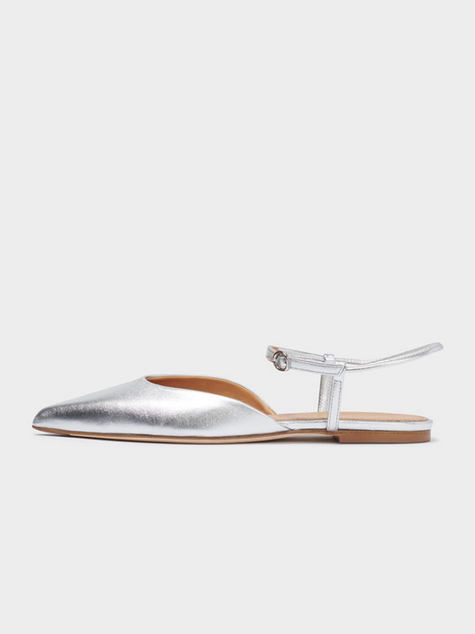 Metallic Silver Pointed-Toe Vegan Leather Flats With Ankle Strap