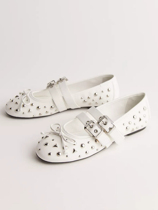 White Bow Studded Ballet Flats Mary Janes With Grommet Buckled Strap