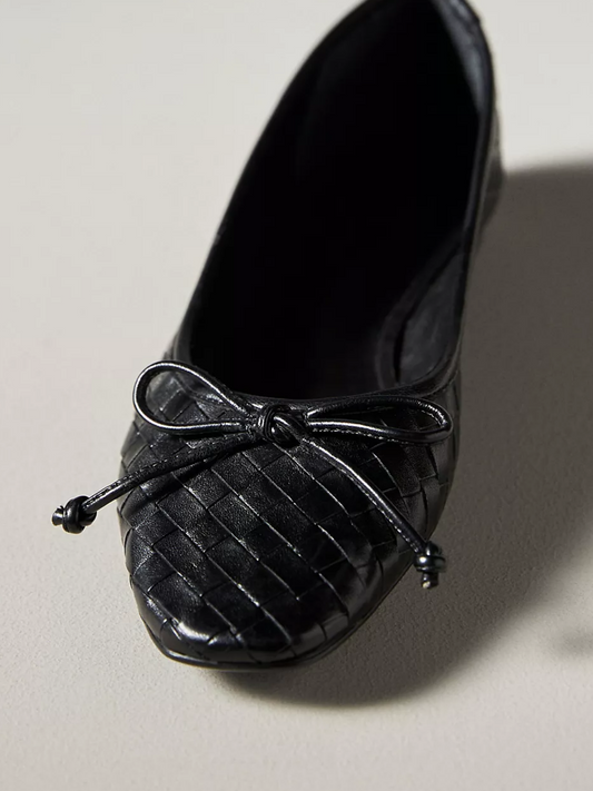Black Woven Bow Square-Toe Slip-On Ballerina Flats