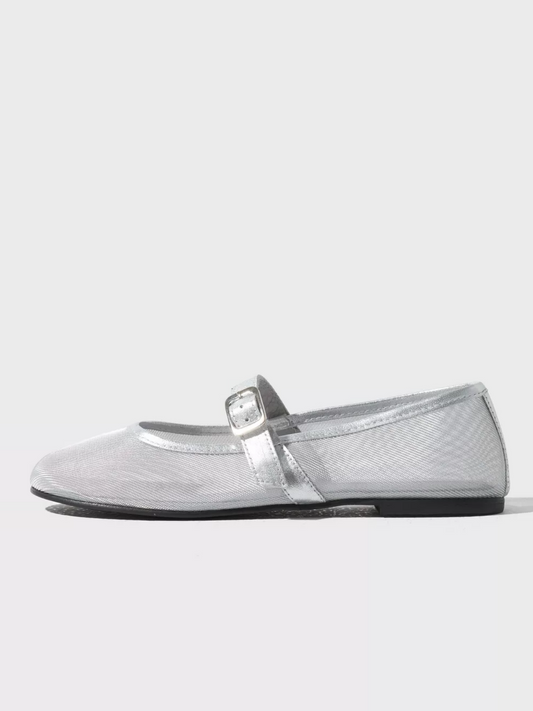 Metallic Silver Mesh Round-Toe Ballerinas Flats Buckled Mary Janes