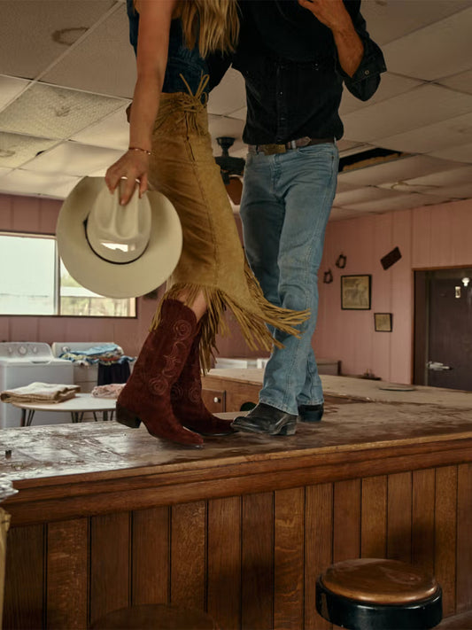 Brick Faux Suede Round-Toe Knee High Wide Calf Embroidery Cowgirl Boots