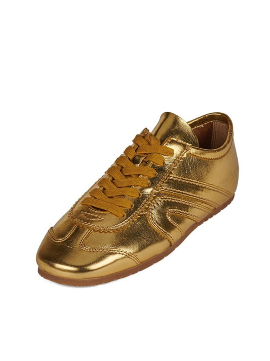 Metallic Gold Round-Toe Lace-Up Classic Sneakers Flats