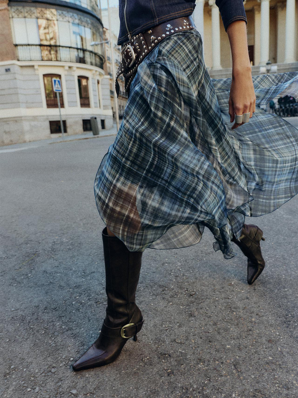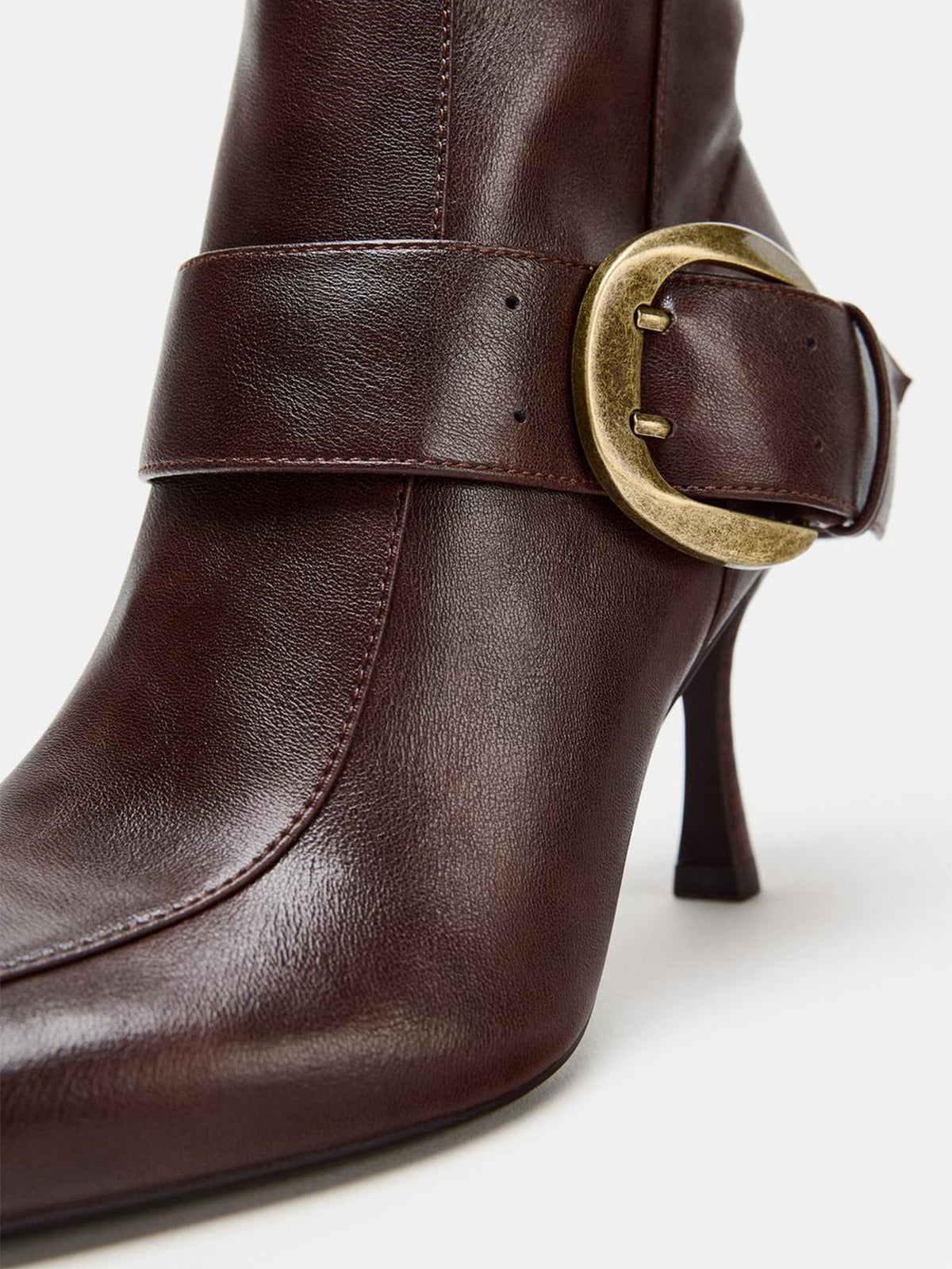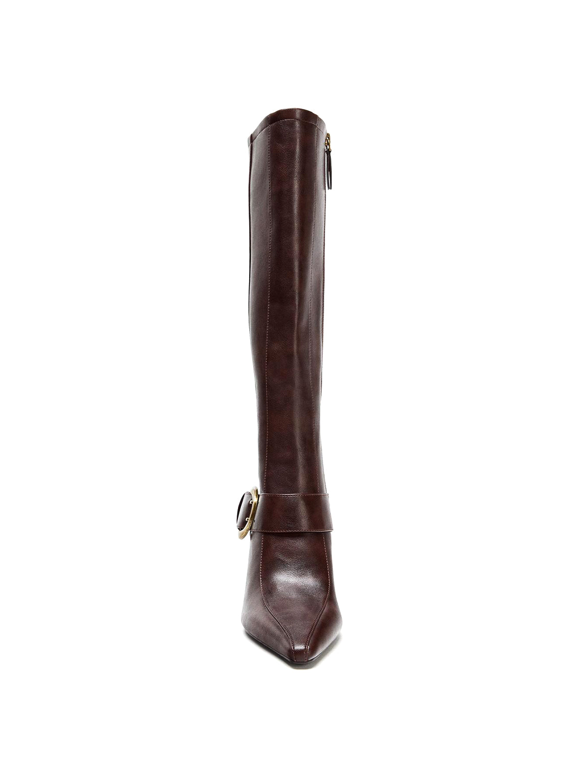 Elegant and bold, these boots feature a pointed-toe silhouette with a wide buckle strap and a convenient full-length zip. The rich brown tone and sleek stiletto heel create a polished, leg-lengthening effect, while the structured design adds confidence and style—perfect for nights out, formal looks, or statement outfits.