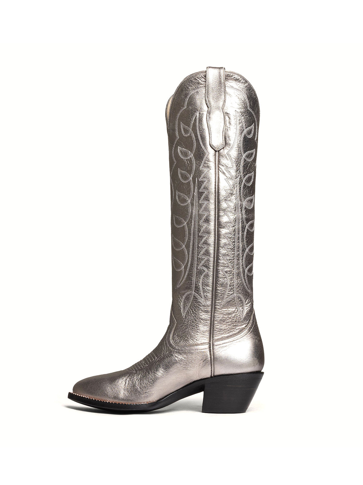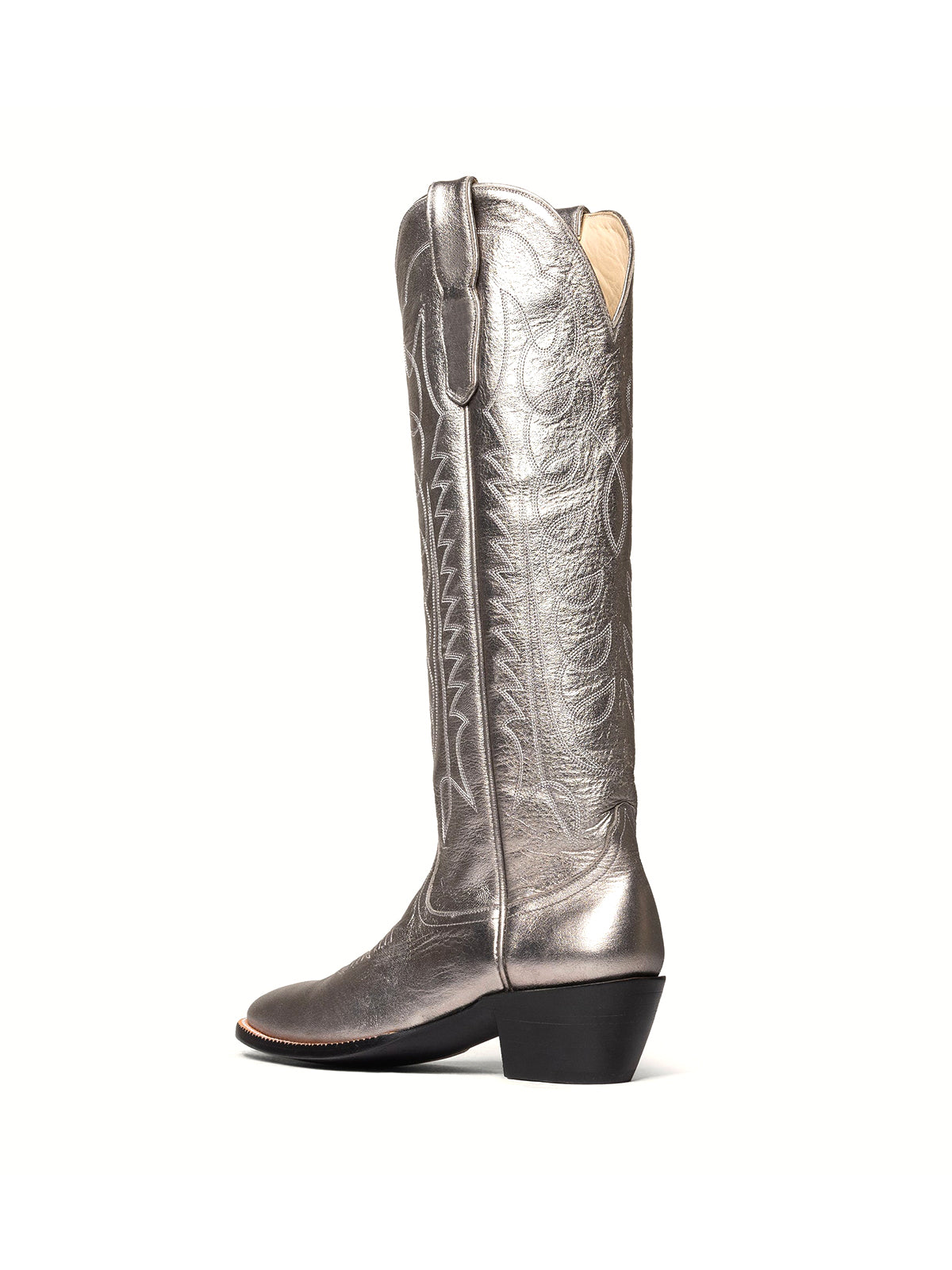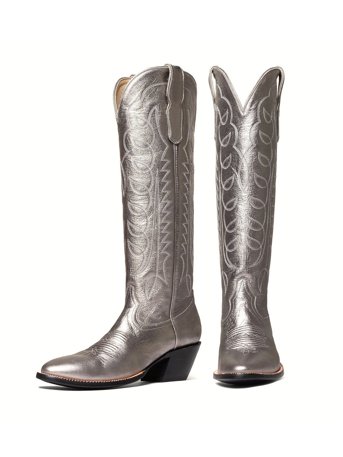 Metallic Silver Classic Almond-Toe Embroidery Tall Knee High Wide Calf Cowgirl Boots