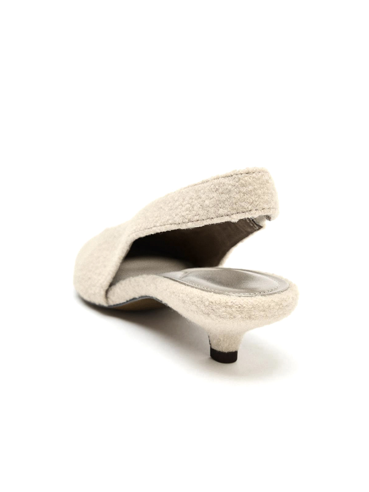 Soft and elegant, these off-white kitten heels feature a sharp pointed-toe silhouette wrapped in a cozy lint-textured finish. The wide slingback strap provides a comfortable, secure fit, while the low kitten heel adds subtle lift with everyday ease—perfect for refined daily looks, workwear, or understated statement styling.