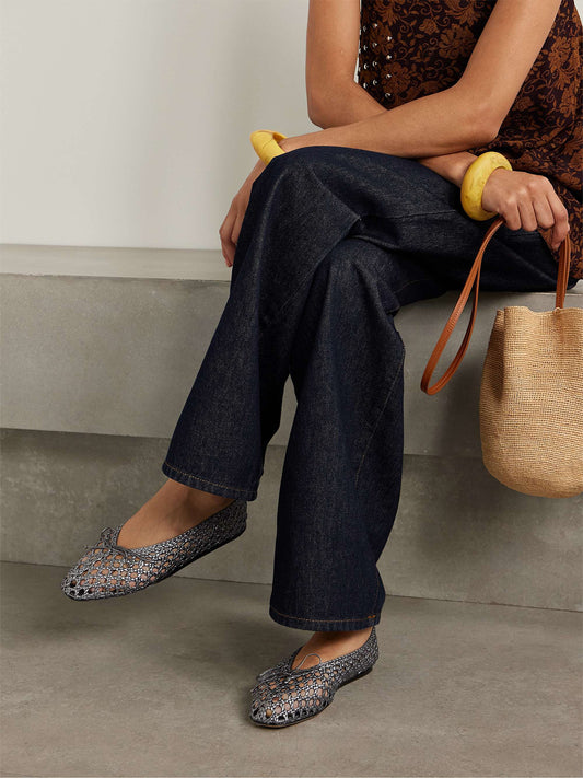 Dark Blue Faux Suede Woven Square-Toe Front Bow Ballet Flats