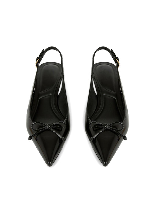 Black Pointed-Toe Front Bow Slingback Kitten Heels