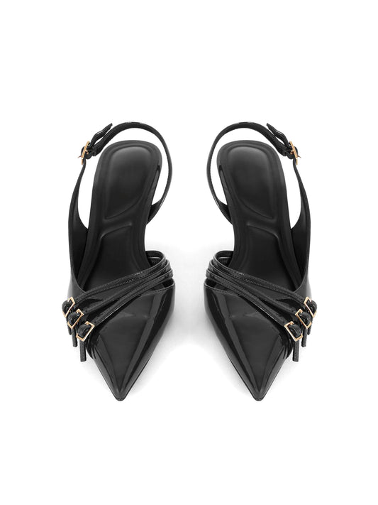Patent Black Pointed-Toe Front Three Straps Slingback Kitten Heels