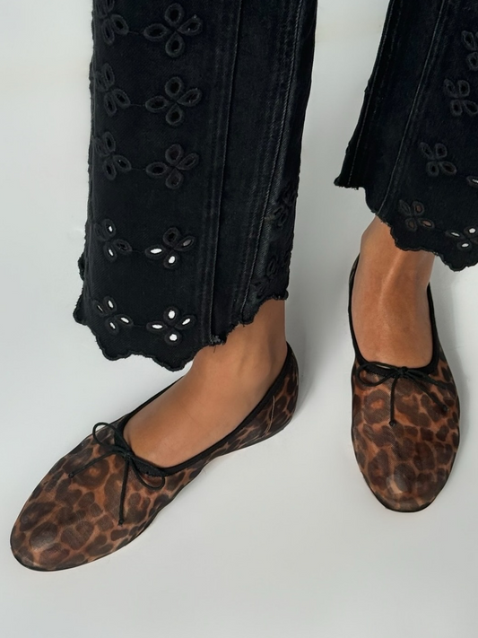 Leopard Mesh Almond-Toe Ballet Bow Flats