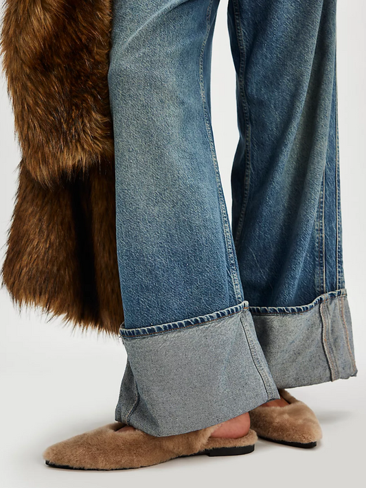Tan Fluffy Pointed-Toe Slip-On Wrapped Ankle Strap Flats