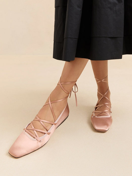 Blush Pink Cloth Square-Toe Lace-Up Ballet Flats