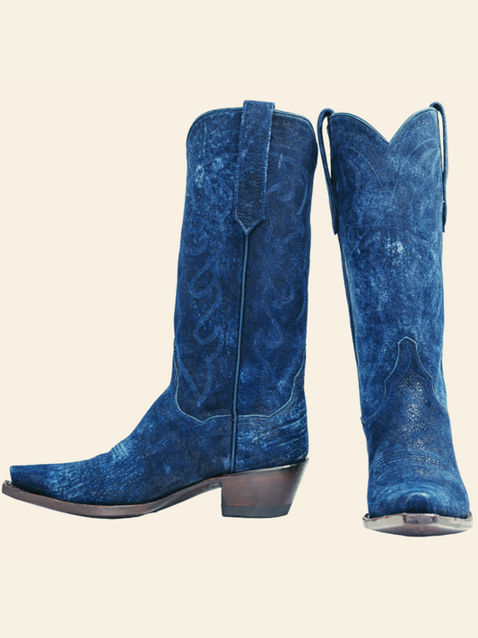 Navy Blue Faux Suede Snip-Toe Embroidery Mid Calf Cowgirl Boots