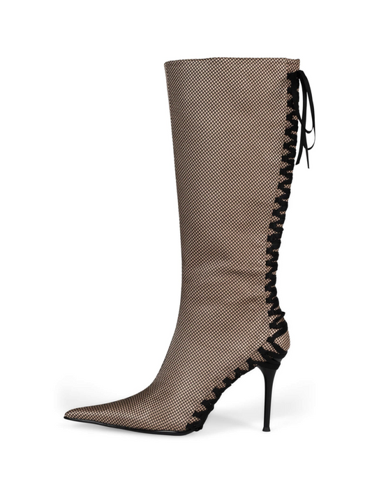 Metallic Fabric Champagne Full-Zip Mid Calf Stiletto Boots With Corset Lacing And Fishnet Overlay