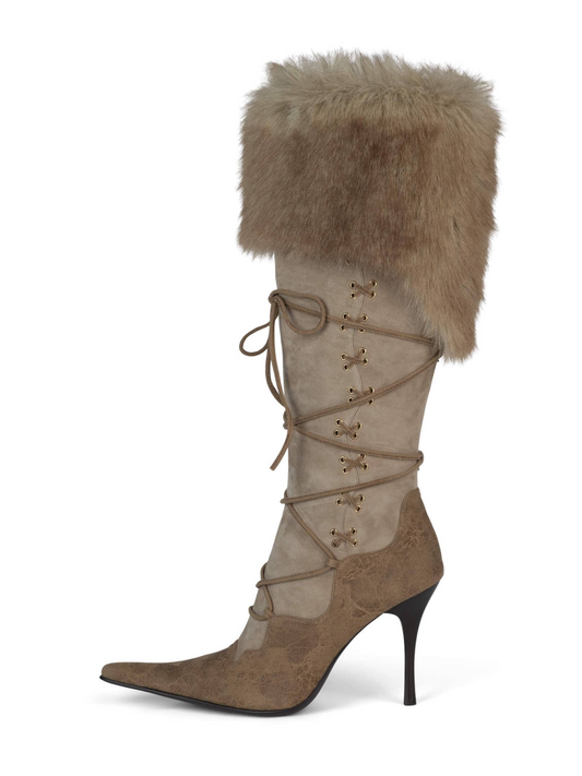 Contrast Brown And Beige Full-Zip Mid Calf Stiletto Boots With Lace-Up And Plush Collar