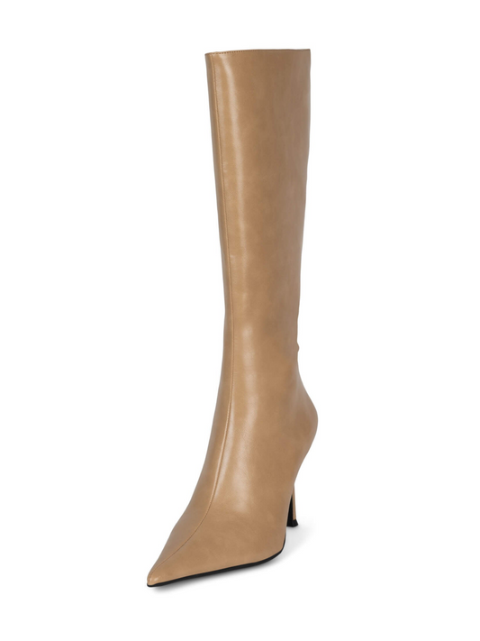 Light Tan Full-Zip Pointed-Toe Mid Calf Stiletto Boots