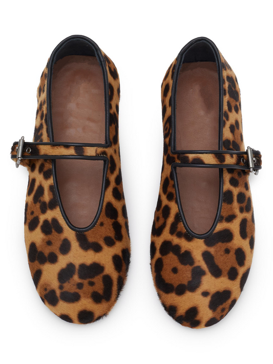 Leopard Faux Suede Almond-Toe Adjustable Metal Clasp Mary Janes Ballet Flats