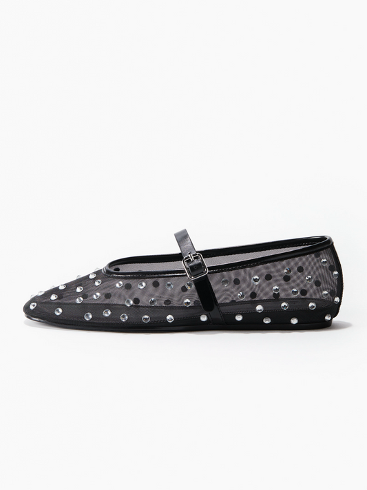 Black Round-Toe Rhinestone Adjustable Clasp Mary Janes Ballet Mesh Flats