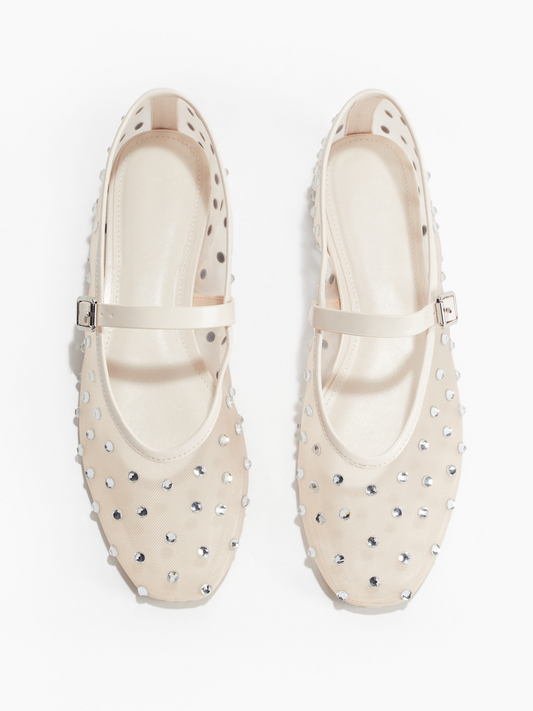 Ivory Round-Toe Rhinestone Adjustable Clasp Mary Janes Ballet Mesh Flats