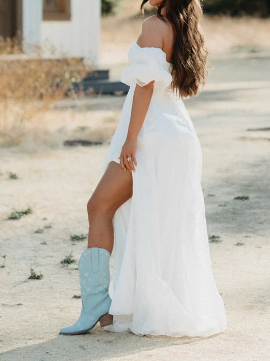 Flowers Embroidery Snip-Toe Mid Calf Cowgirl Boots - White