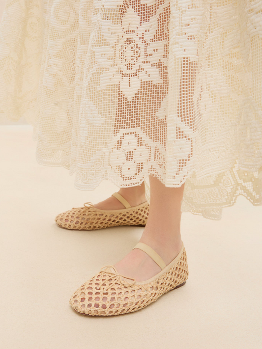 Beige Almond-Toe Straw-Woven Elastic Bridge Strap Bow Mesh Ballet Flats