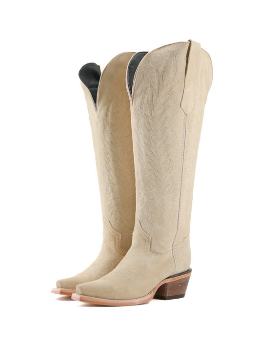 Bone Faux Suede Snip-Toe Half-Zip Embroidery Knee High Cowgirl Boots