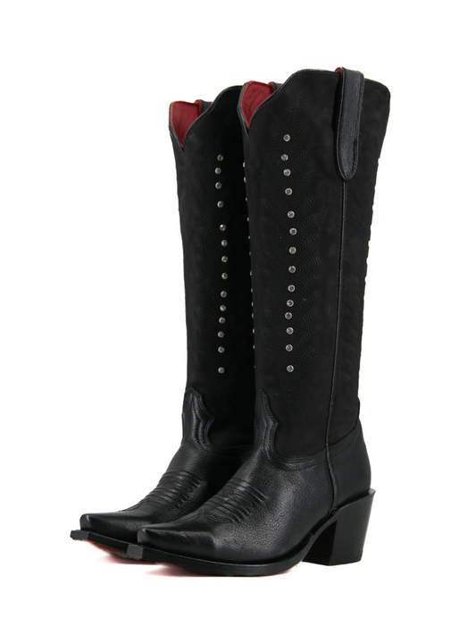 Black Contrast Vegan Leather And Faux Suede Snip-Toe Half-Zip Classic Embroidery Knee High Cowgirl Boots