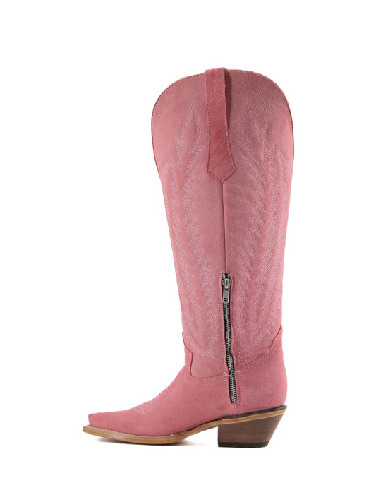 Pink Faux Suede Snip-Toe Half-Zip Embroidery Knee High Cowgirl Boots