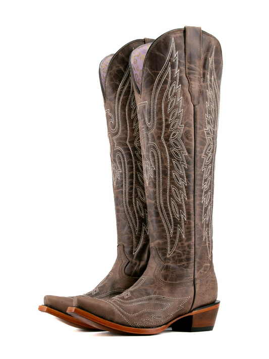 Distressed Tobacco Snip-Toe Eagle Embroidery Half-Zip Knee High Cowgirl Boots