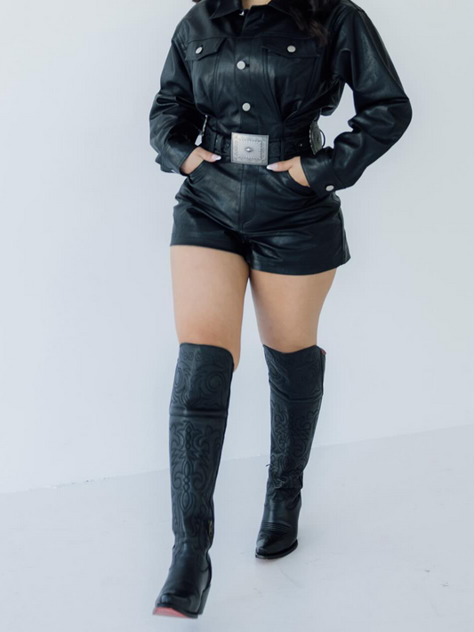 Black Snip-Toe Half-Zip Embroidery Tall Knee High Cowgirl Boots