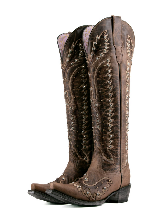 Distressed Tobacco Snip-Toe Studded Eagle Embroidery Half-Zip Knee High Cowgirl Boots