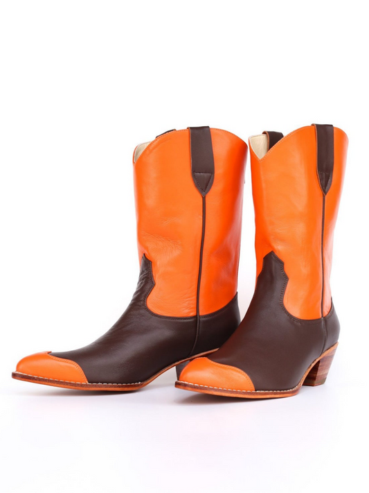 Contrast Orange And Brown Back-Zip Mid Calf Cowgirl Boots