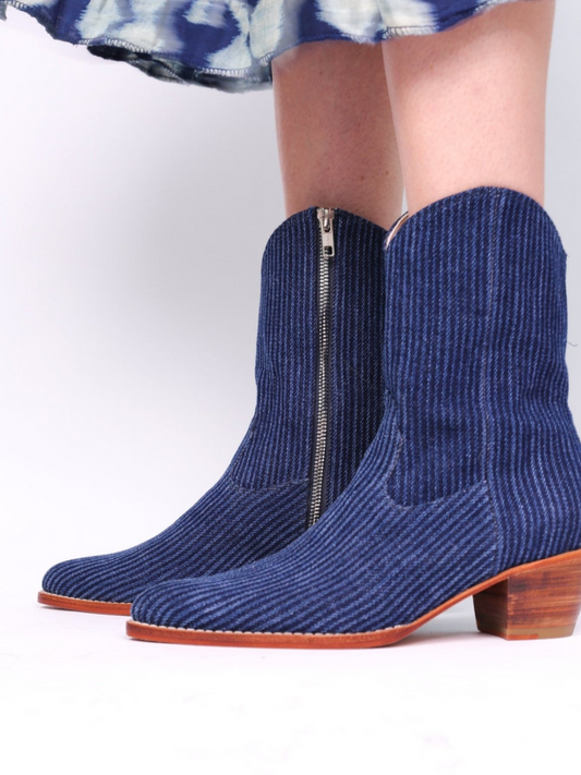Blue Striped Denim Almond-Toe Full-Zip Mid Calf Cowgirl Boots