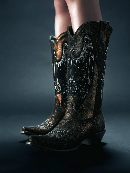 Metallic Bronze Snip-Toe Studded Rhinestone Wide Mid Calf Tall Cowgirl Boots