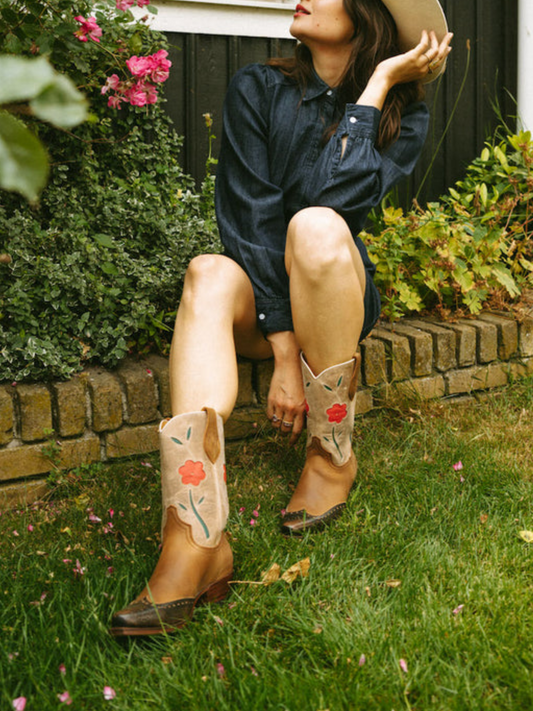 Contrast Tan And Brown Faux Suede Snip-Toe Flower Inlay Wide Mid Calf Cowgirl Boots