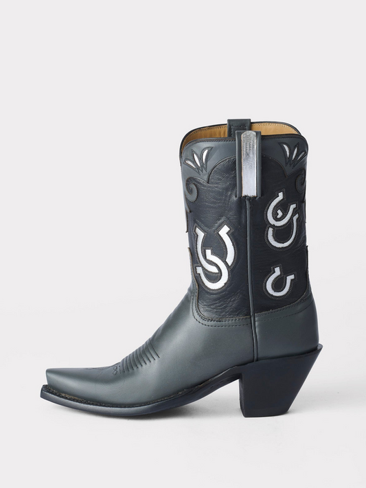 Contrast Grey And Dark Grey Snip-Toe Horseshoe Inlay Wide Mid Calf Cowgirl Boots