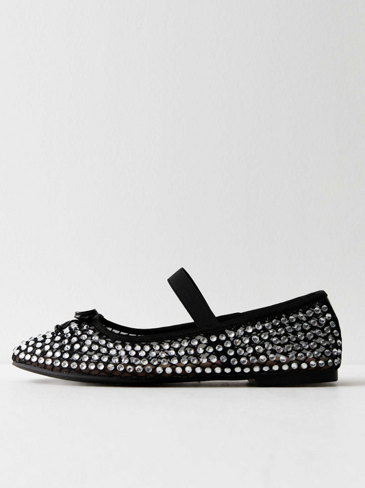 Black Bow Fishnet Strass Ballet Flats Mary Janes With Full-Embellished Rhinestone