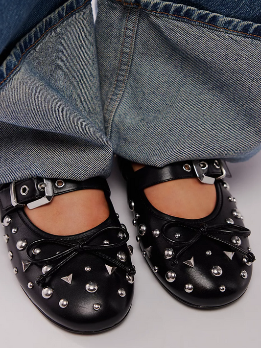 Black Bow Studded Ballet Flats Mary Janes With Grommet Buckled Strap