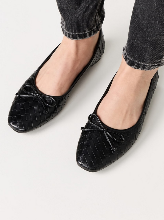 Black Bow Woven Square-Toe Slip-On Ballet Flats