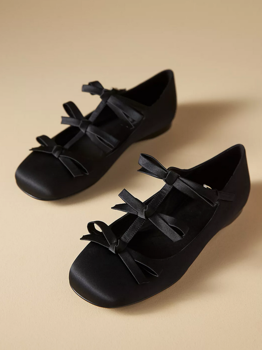 Black Cloth Square-Toe Bow Front Strap Ballet Flats