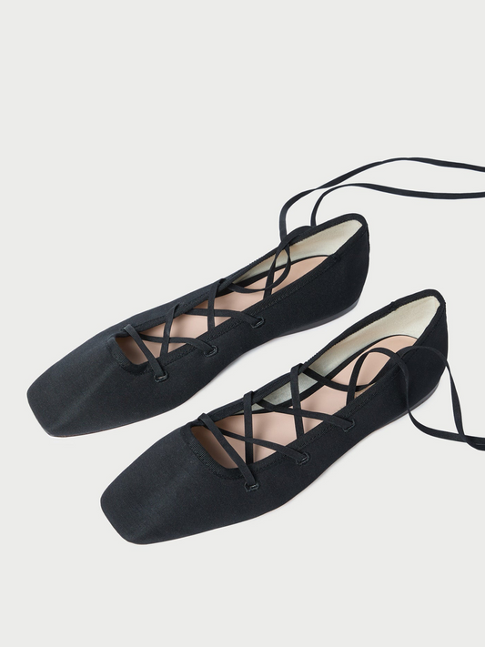 Black Cloth Square-Toe Lace-Up Ballet Flats