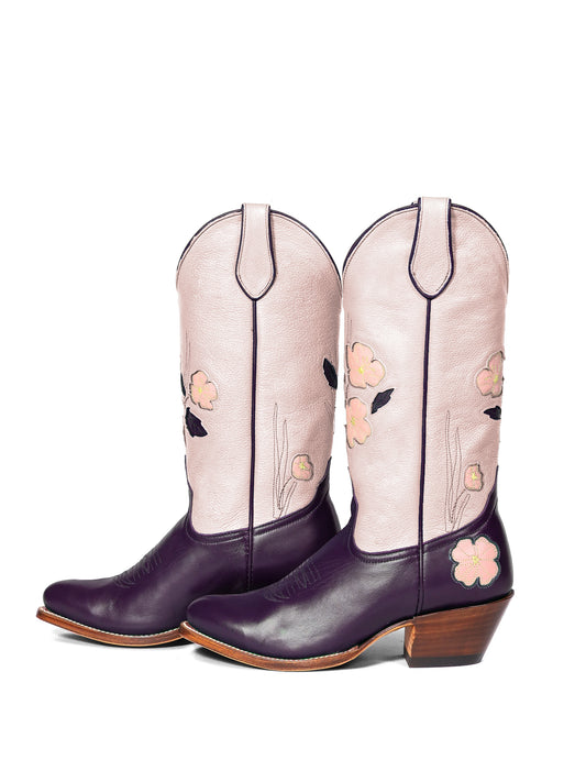 Contrast Pink And Purple Almond-Toe Fresh Flower Inlay Mid Calf Cowgirl Boots