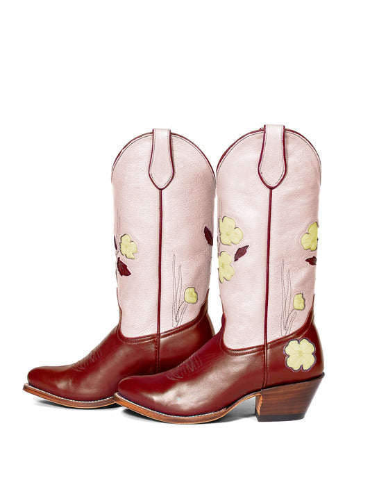 Contrast Pink And Brown Almond-Toe Fresh Flower Inlay Mid Calf Cowgirl Boots