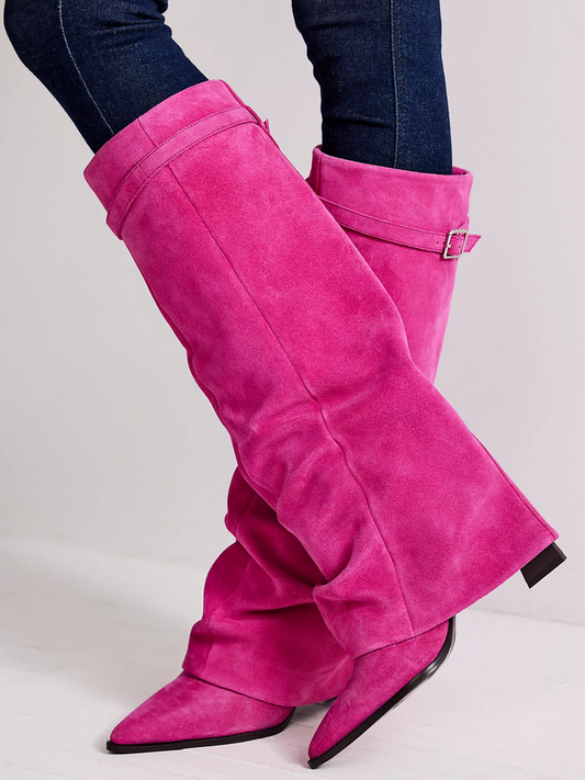 Faux Suede Pointed-Toe Buckle Fold-Over Mid Calf Boots - Fuchsia